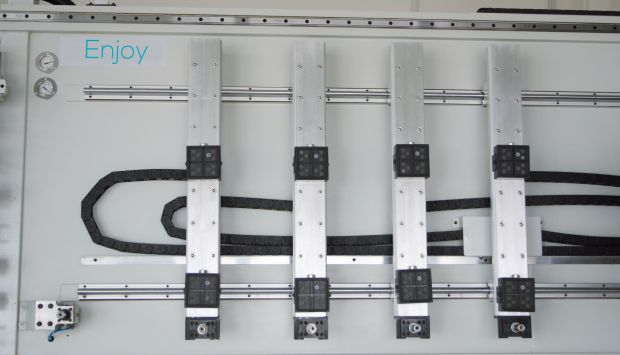 Sulla traversa sono montate n.4 barre prismatiche e due assi Z cosi’da avere i due gruppi operatori completamente separati ed indipendenti, per un totale di 5 assi controllati.